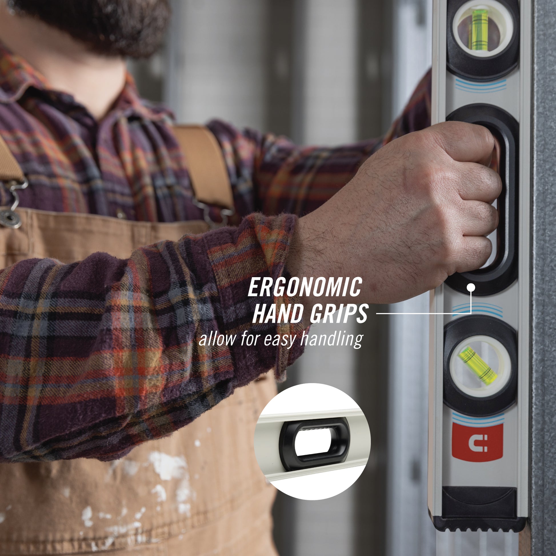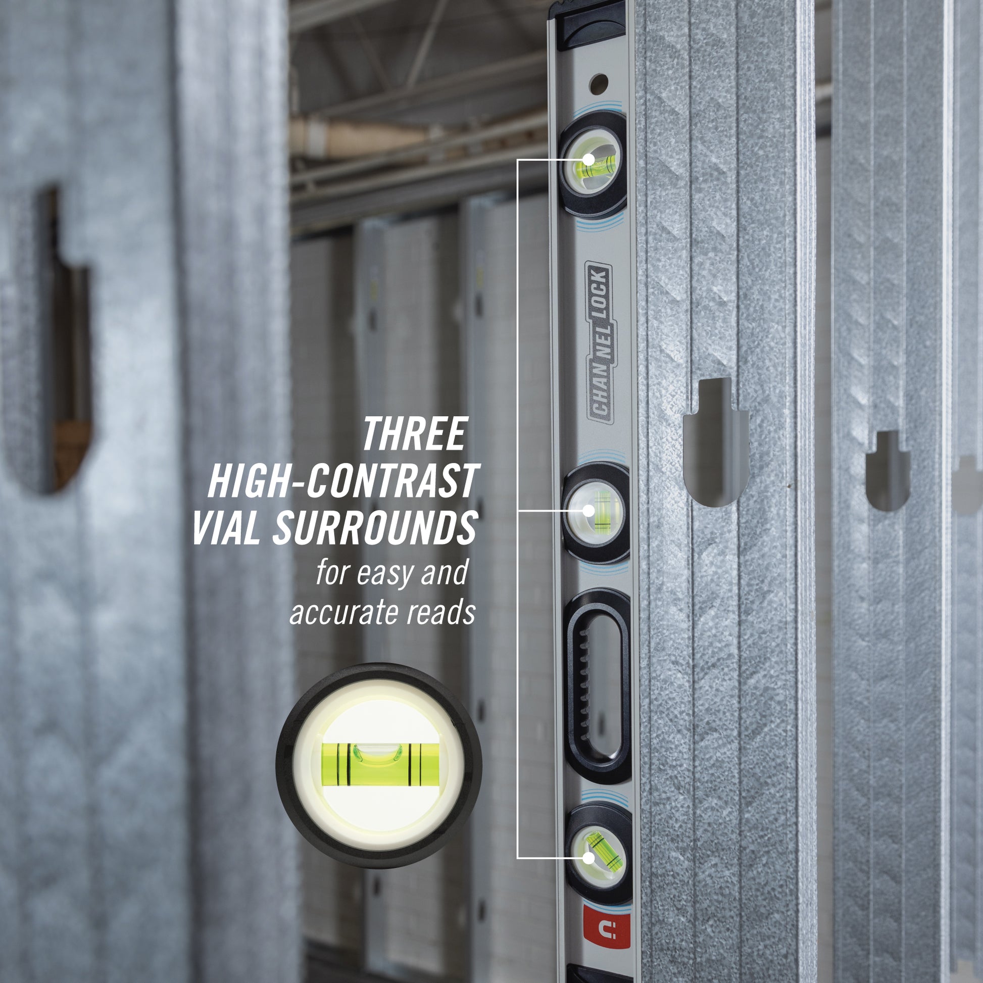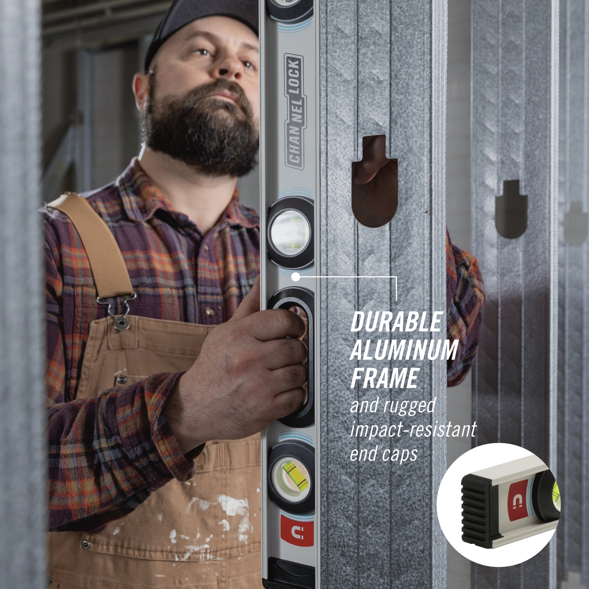 Set your work straight with the CHANNELLOCK® 2 Foot I-Beam Magnetic Level. Inspired by America's hardworking tradesmen and women, this spirit level features three high-contrast vial surrounds for level, plumb and 45° vials, an easy-to-read top-view window, and a built-in magnetic strip that offers a strong hold on metal surfaces. Its durable aluminum frame and rugged shock-absorbing end caps are built for years of hard work. Plus, its ergonomic hand grips allow for easy handling while wearing gloves. With ±0.0005 in./in. accuracy, this professional-grade level tool won’t just do the job—it’ll flat-out conquer it.