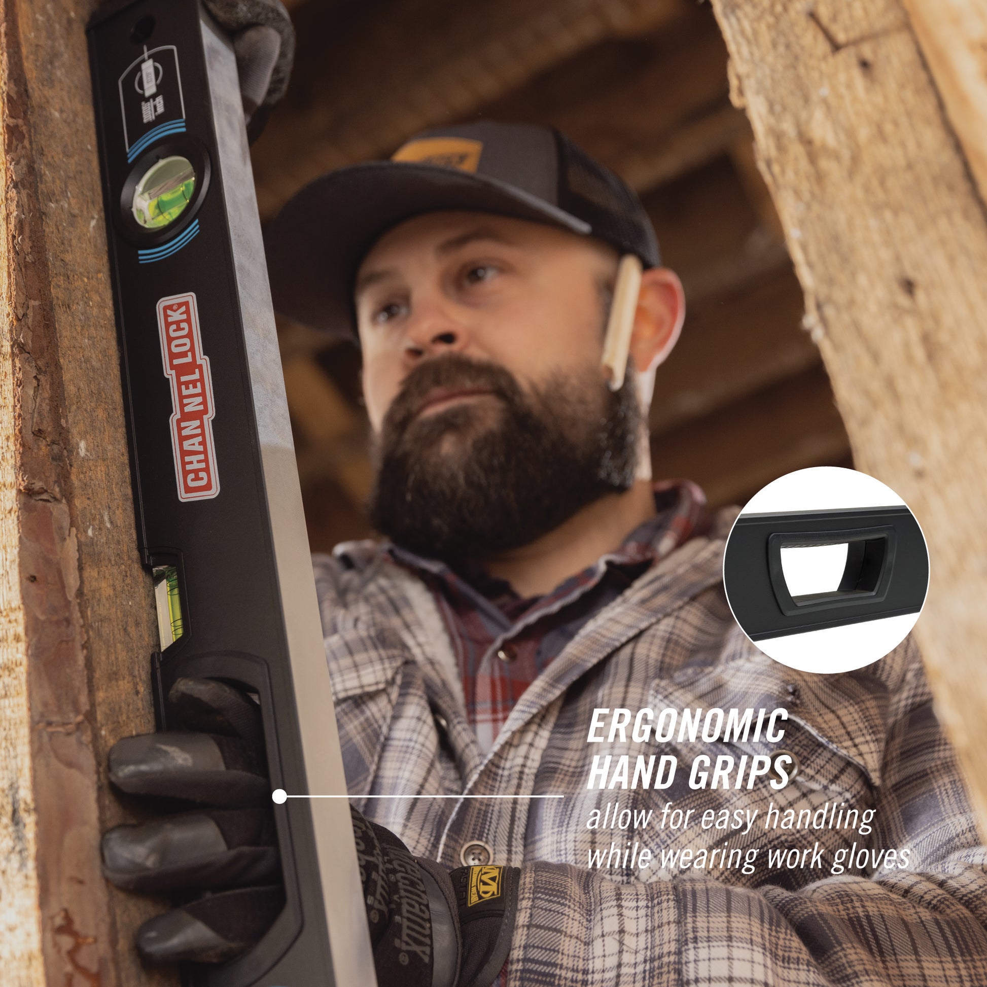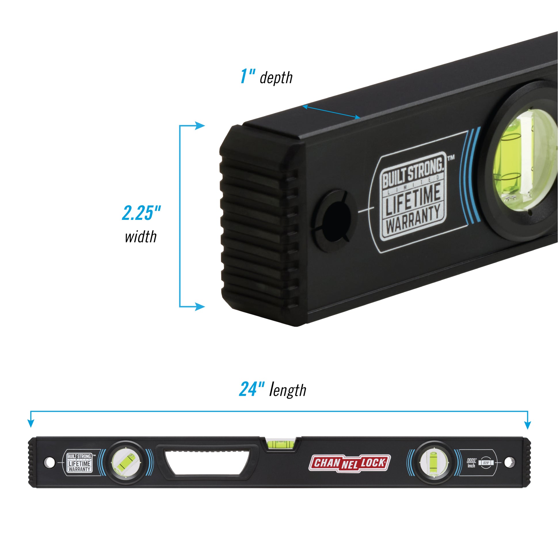 Get it right the first time with the CHANNELLOCK® 2 Foot Box Level. Inspired by America's hardworking tradesmen and women, this box level features high-contrast vial surrounds with a 300° view center block vial for superior readability, a durable aluminum frame with precision-milled edges, and fixed shock-absorbing end caps to support years of hard work. Plus, its ergonomic hand grips allow for easy handling while wearing gloves. With ±0.0005 in./in. accuracy, this professional-grade level tool is built to conquer any challenge you’re up against.