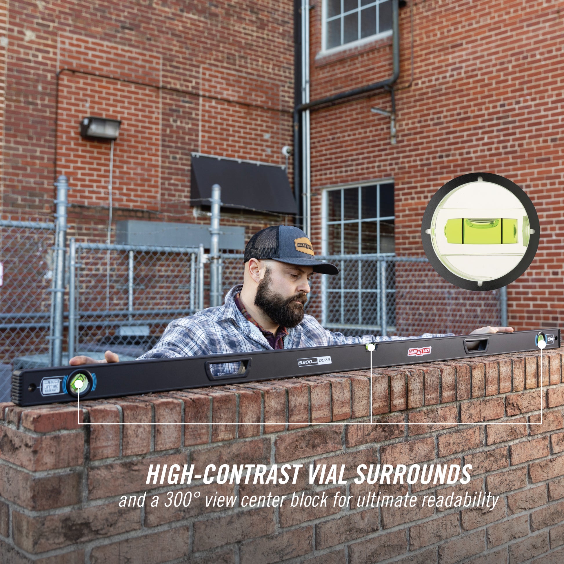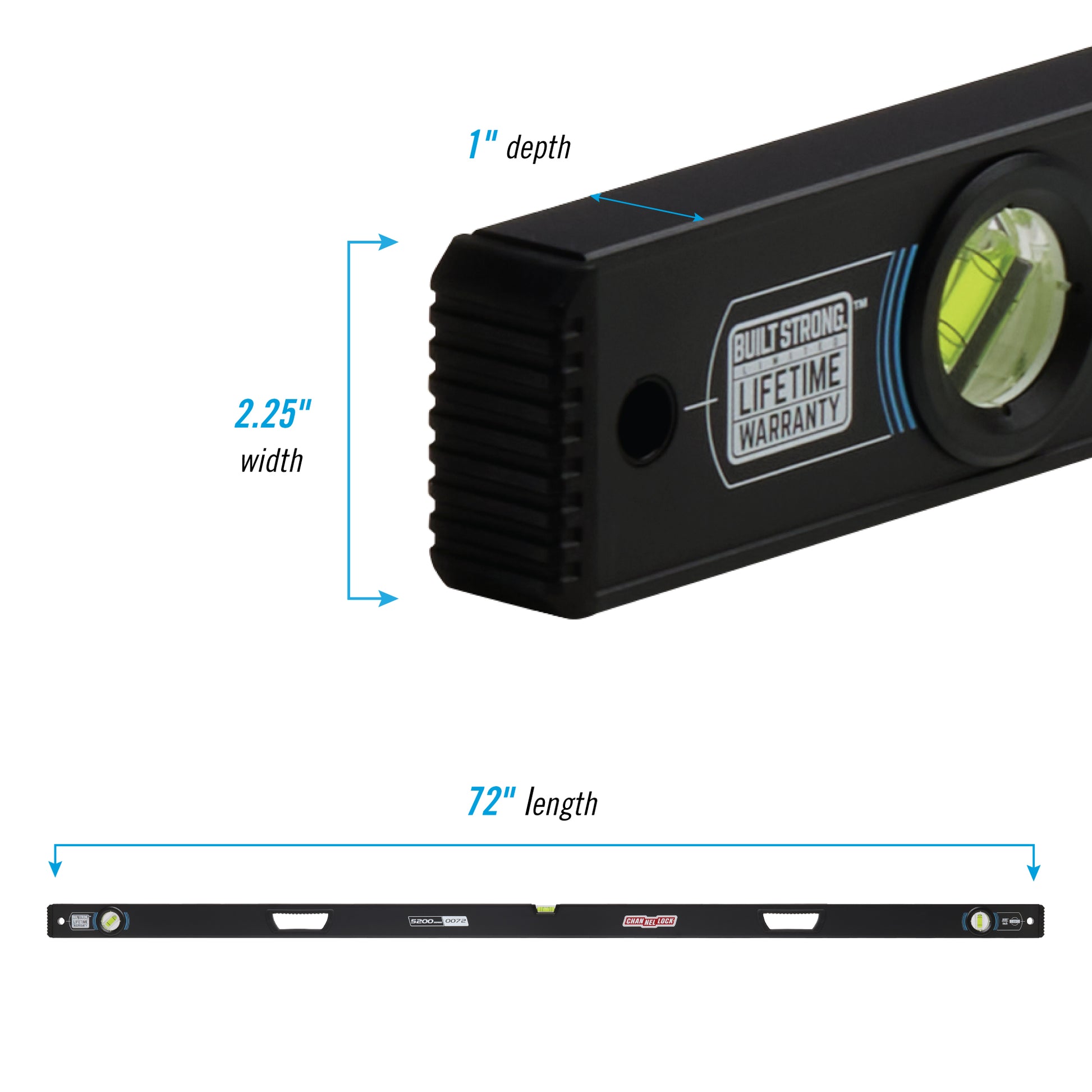 Get it right the first time with the CHANNELLOCK® 6 Foot Box Level. Inspired by America's hardworking tradesmen and women, this box level features high-contrast vial surrounds with a 300° view center block vial for superior readability, a durable aluminum frame with precision-milled edges, and fixed shock-absorbing end caps to support years of hard work. Plus, its ergonomic hand grips allow for easy handling while wearing gloves. With ±0.0005 in./in. accuracy, this professional-grade level tool is built to conquer any challenge you’re up against.