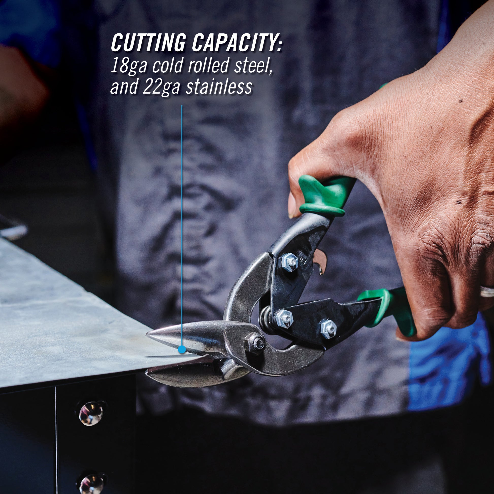 CHANNELLOCK® Offset Snips are the ultimate tool in tight spaces. Easily cut curves and straight cuts with 18ga cold rolled and 22ga stainless steel while the offset design directs material away from the operator. CHANNELLOCK® Aviation Snips are 100% made in USA and the blades are forged from molybdenum alloy steel for durability and strength. The combination of precision machined serrations on cutting blades and 8:1 compound leverage with high tensile steel handles greatly optimizes cutting performance with minimal effort.