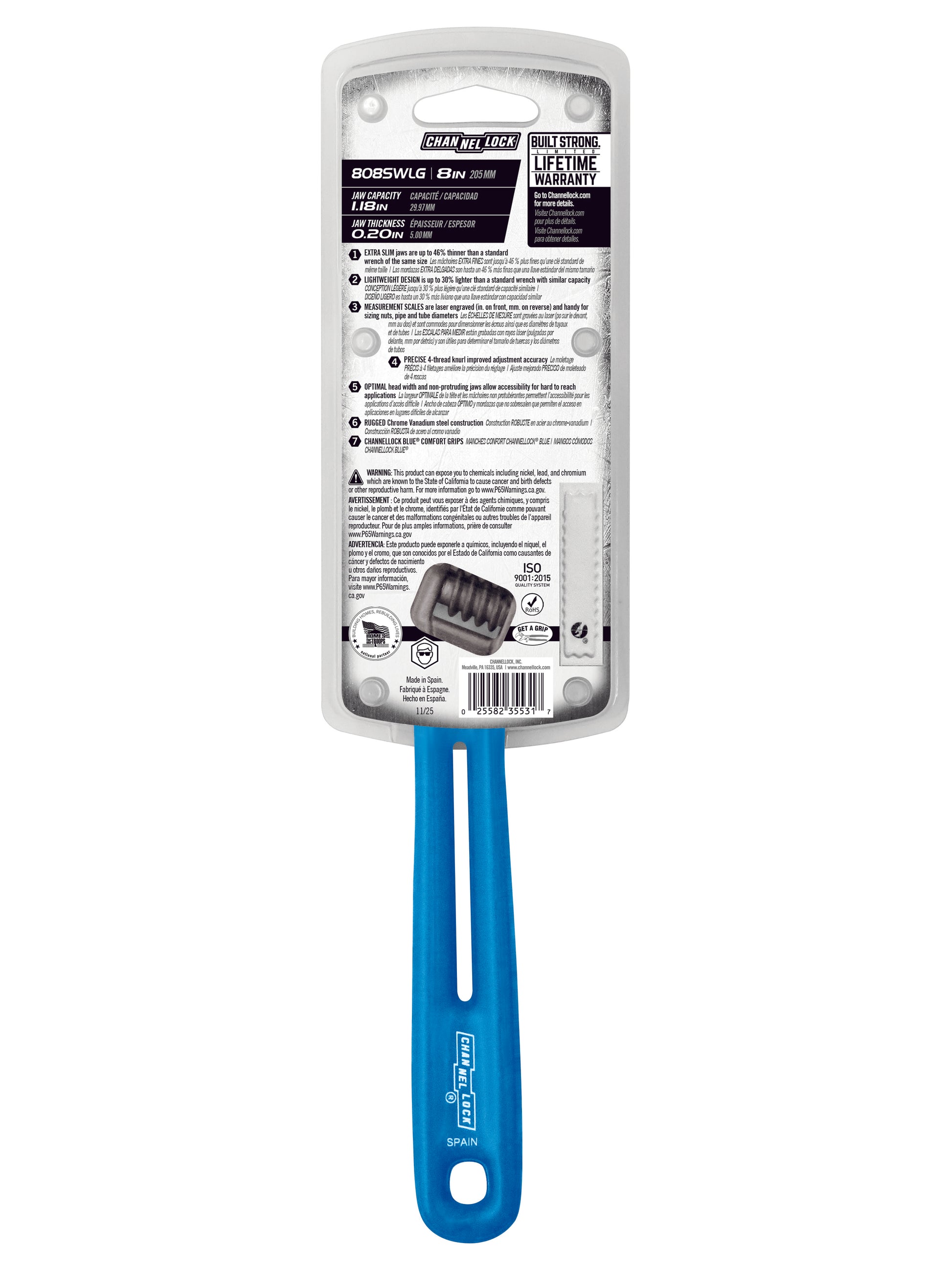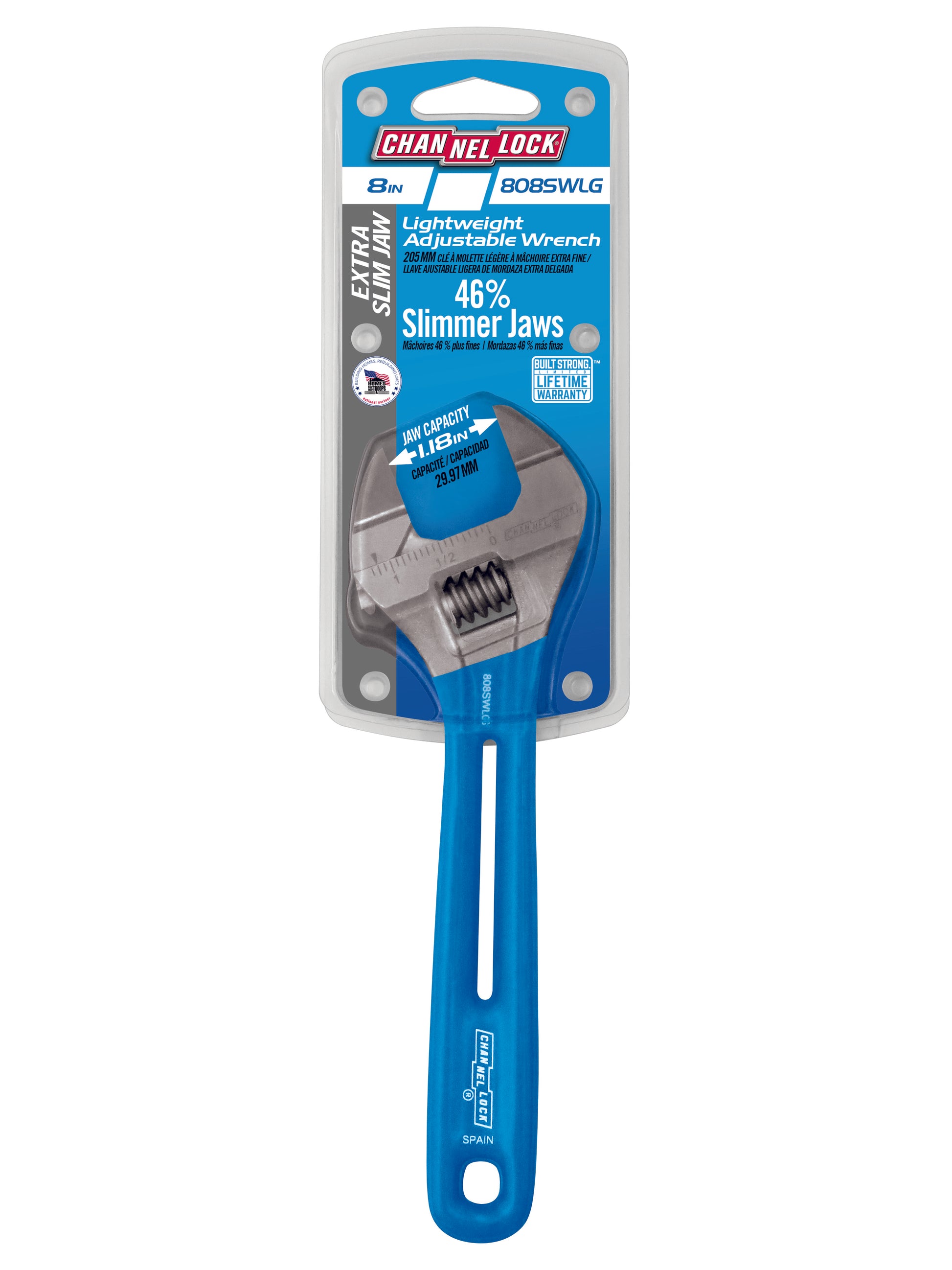 Tackle tight spaces and tough jobs with the CHANNELLOCK® 8-Inch Adjustable Lightweight Dipped Wrench. Compared to traditional wrenches, it’s up to 30% lighter, features 46% slimmer jaws for greater access to hard-to-reach areas, and delivers 25% more jaw capacity to handle larger nuts and bolts. Forged from rugged chrome Vanadium steel for superior durability, it features laser-engraved measurement scales for sizing pipe and tubing, a precise 4-thread knurl for improved adjustment accuracy, and CHANNELLOCK BLUE® grips for reduced hand fatigue. CHANNELLOCK® Wrenches are made in Spain to the same demanding specifications as its USA-made tools. This precision wrench is only intended for use that does not exceed 400 in-lbs of torque.