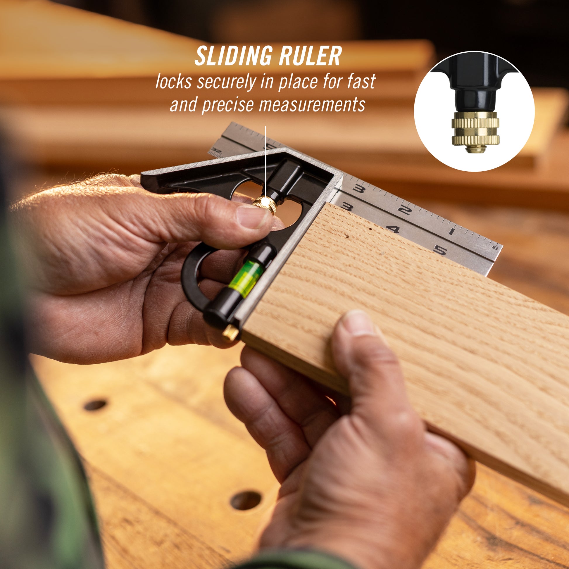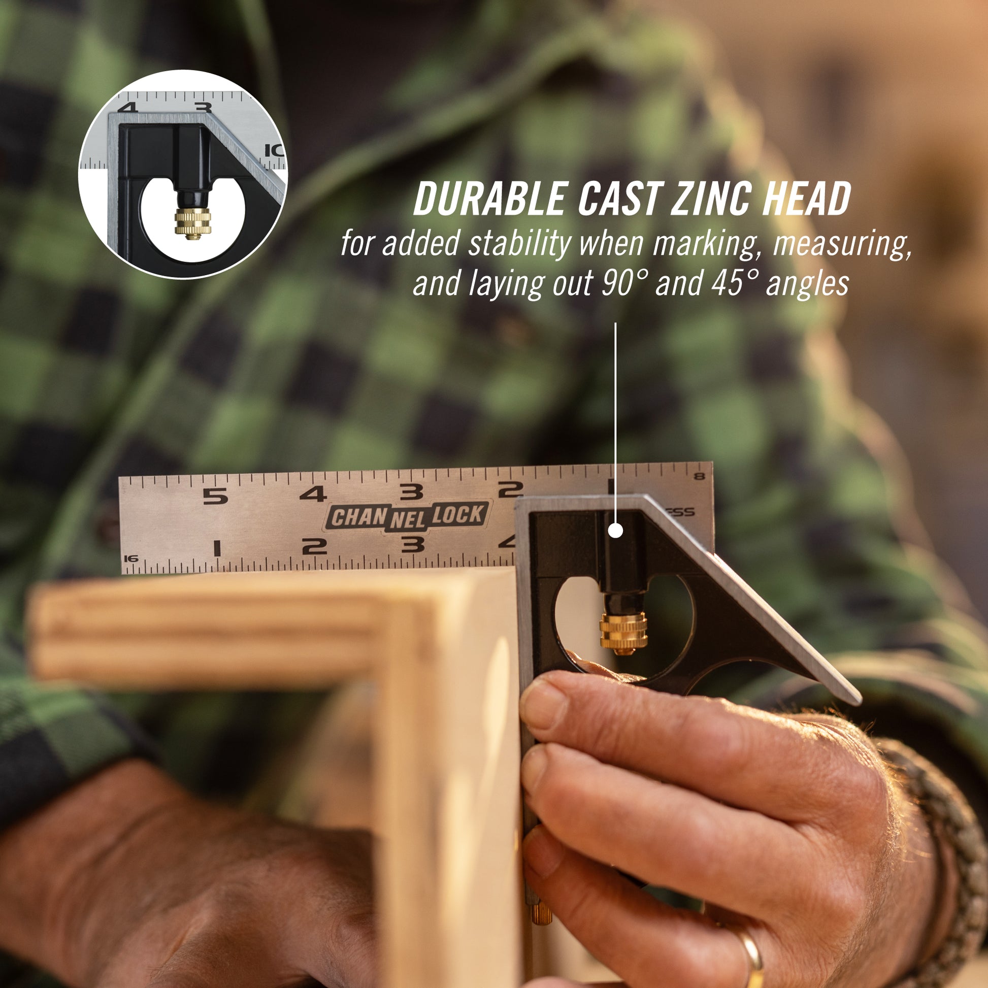 When precision matters most, reach for the CHANNELLOCK® 6-Inch Combination Square. The square tool features a rust- and corrosion-resistant 6" stainless steel blade and permanent laser-etched markings in 1/32” and 1/16” graduations for easy-to-read measurements that won’t fade over time. Its rugged cast zinc body provides the strength and stability needed for marking, measuring, and laying out 90° and 45° angles. Plus, the square offers a built-in sliding ruler that locks securely into place for fast and secure measurements.