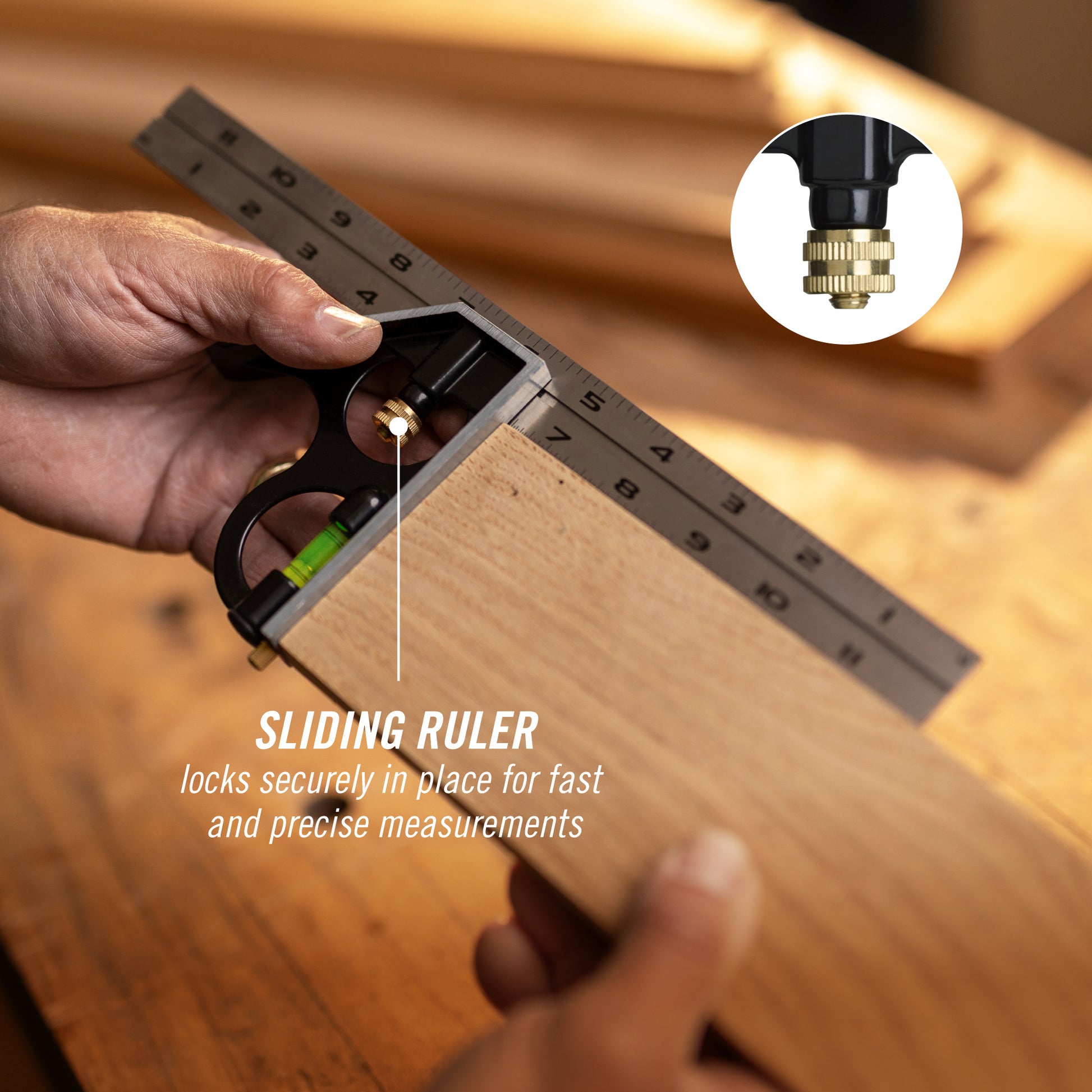 When precision matters most, reach for the CHANNELLOCK® 12-Inch Combination Square. The square tool features a rust- and corrosion-resistant 12" stainless steel blade and permanent laser-etched markings in 1/32” and 1/16” graduations for easy-to-read measurements that won’t fade over time. Its rugged cast zinc body provides the strength and stability needed for marking, measuring, and laying out 90° and 45° angles. Plus, the square offers a built-in sliding ruler that locks securely into place for fast and secure measurements.