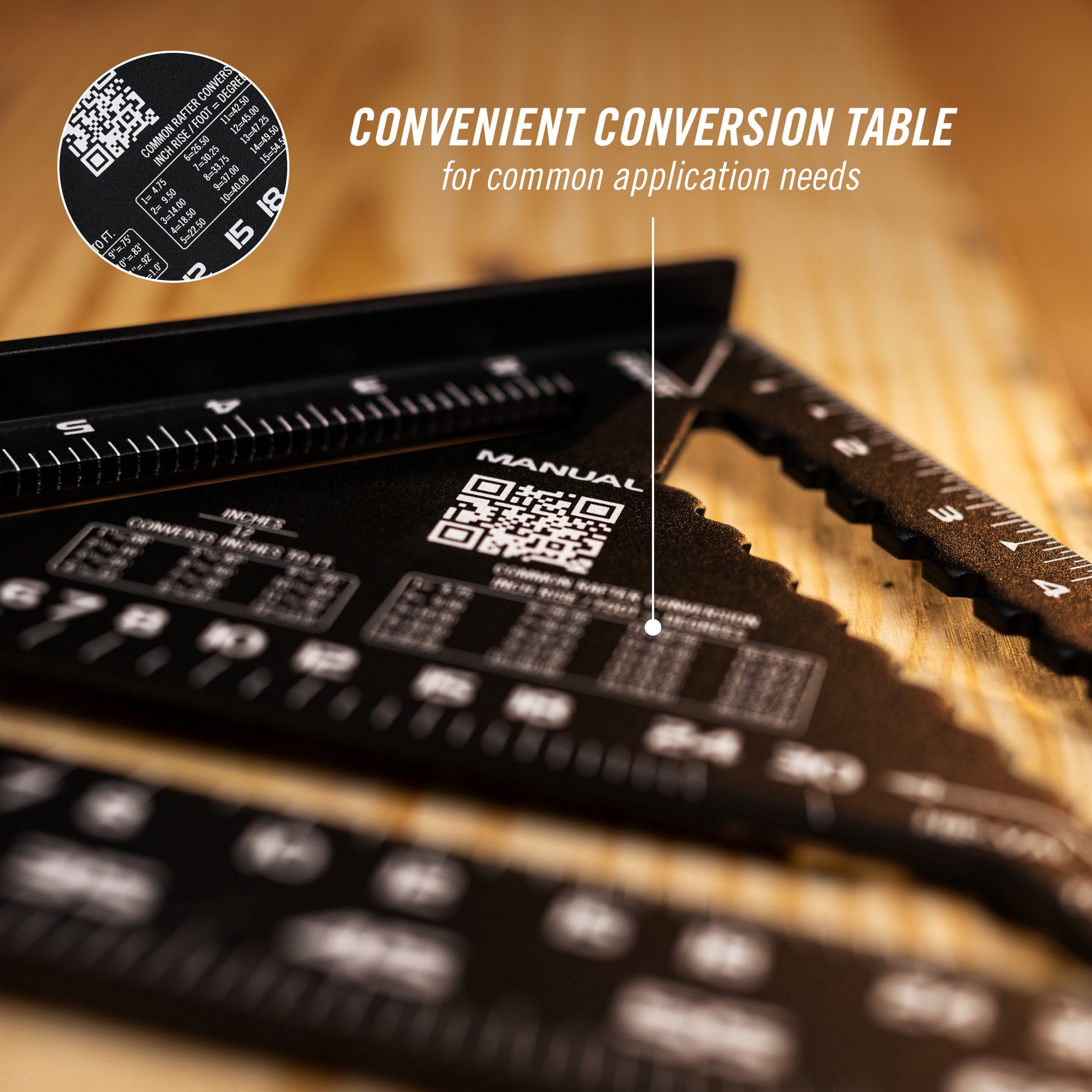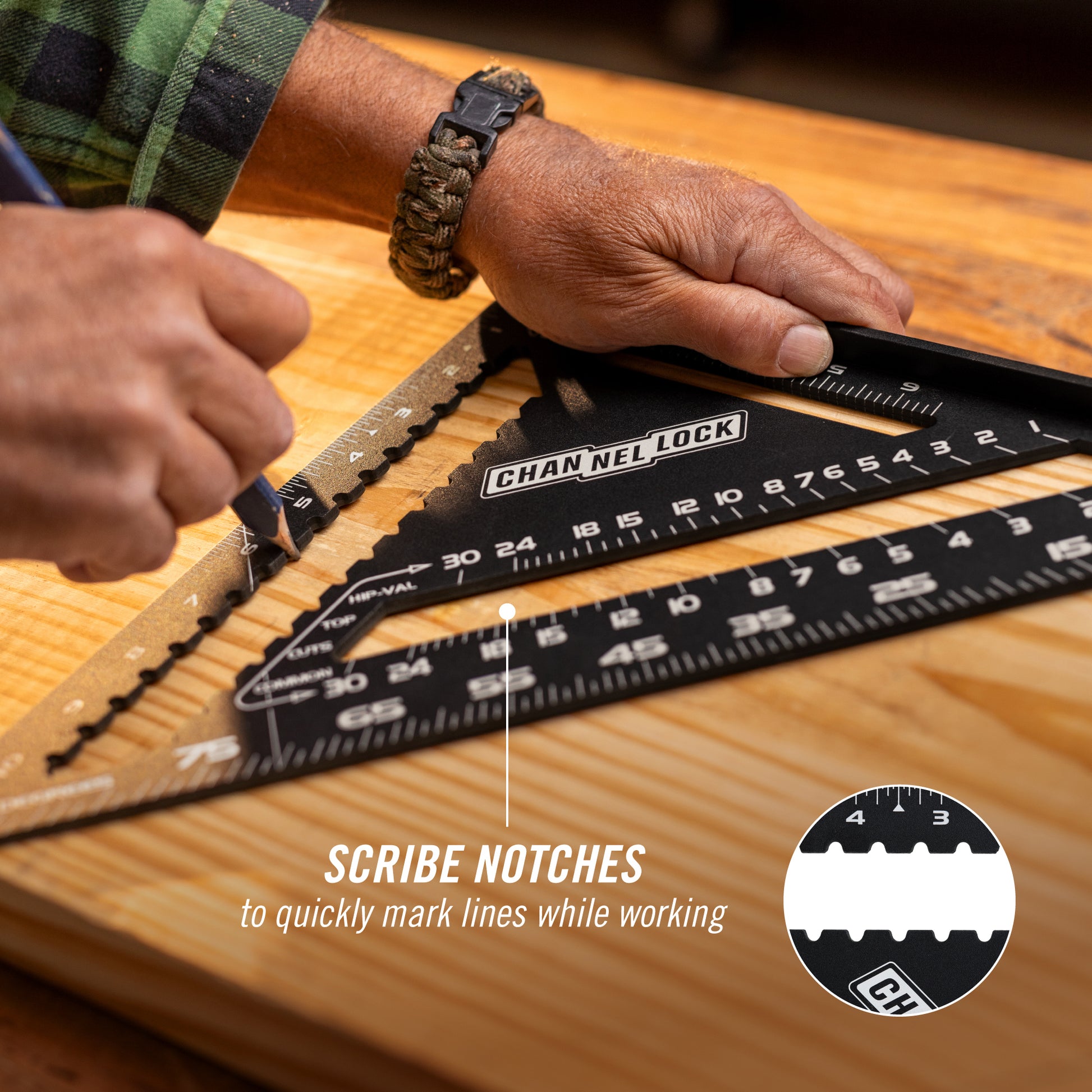 Make every measurement count with the CHANNELLOCK® 12-Inch Laser-Etched Rafter Square. Built to conquer tough jobs, this professional square tool features high-visibility laser-etched markings that won't fade for easy reads in any light condition and precision scribe notches to quickly mark lines on lumber while woodworking or tackling carpentry projects. The CHANNELLOCK® rafter square is made from anodized aluminum for superior rust and corrosion resistance and is more durable than die-cast alternatives. Plus, the square features built-in conversion tables that keep critical measurements at your fingertips and a wide heel for added stability on job site materials. Reach for the CHANNELLOCK® Laser-Etched Rafter Square to get the job done right every single time.