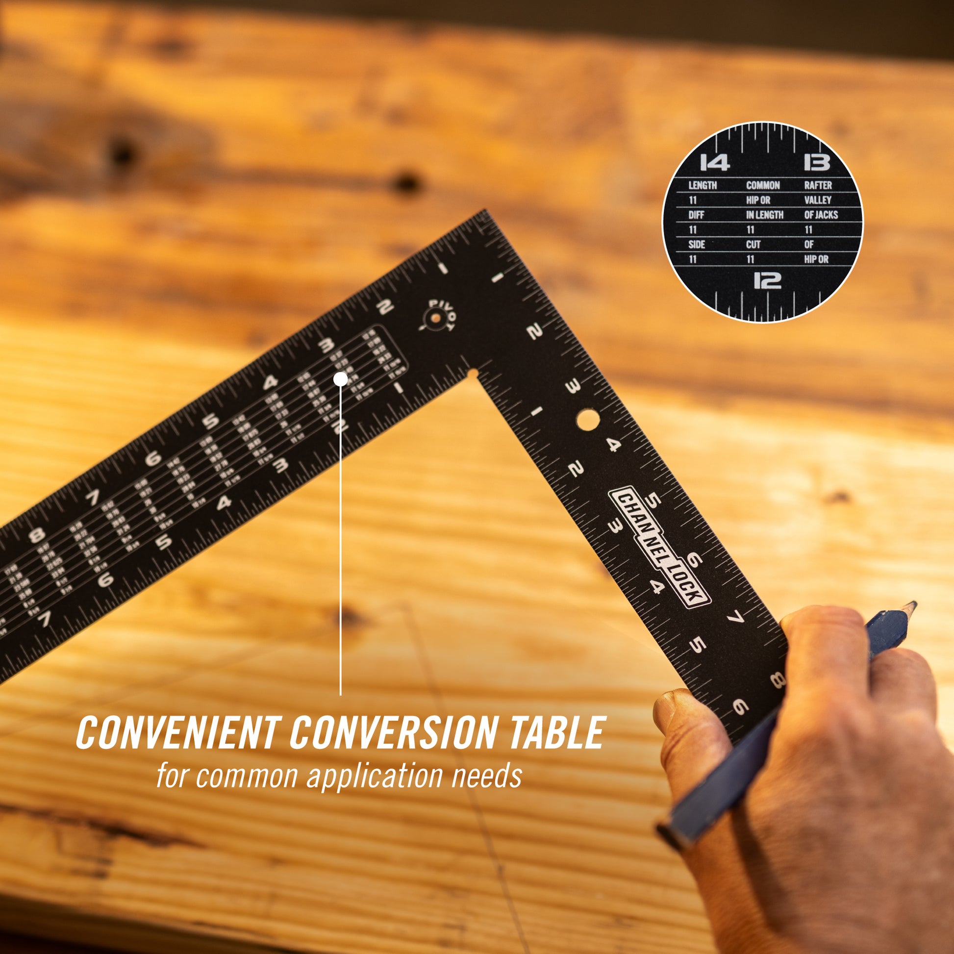 Inspired by America's hardworking tradesmen and women, the CHANNELLOCK® 16”x 24” Laser-Etched Framing Square delivers ultra-accurate measurements on the job. This square tool features permanent laser-etched graduations at 1/8”, 1/10”, 1/12” and 1/16” to allow for clear and easy-to-read measurements that won't fade after heavy-duty use. Its anodized aluminum construction is designed for added strength and wear-resistance to support years of hard work, while its wide body provides greater stability for precise layouts and measurements. The square also features an integrated conversion table to keep critical measurements at your fingertips. Reach for the CHANNELLOCK® Laser-Etched Framing Square to get the job done right every single time.