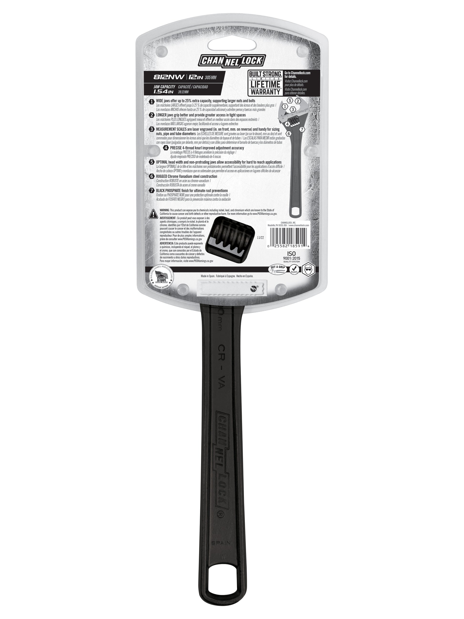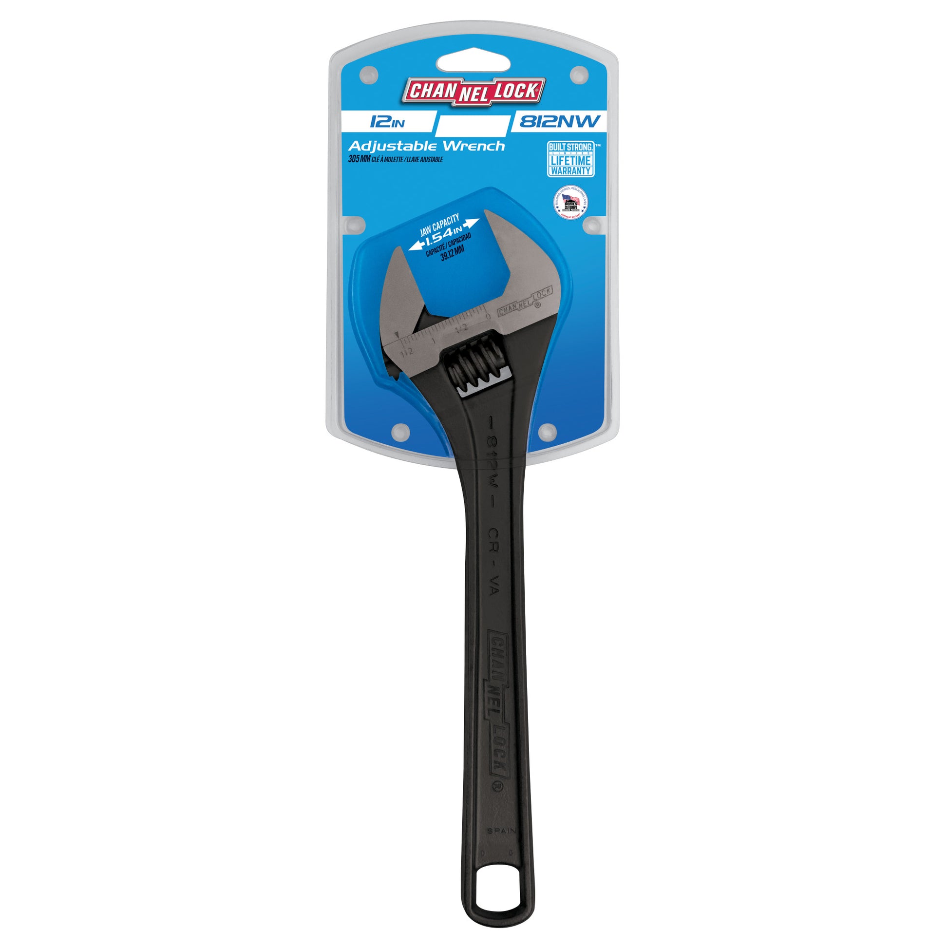 The CHANNELLOCK® 812NW 12" Wide Adjustable Wrench has a greater jaw capacity to support larger nuts and bolts with thinner, non-protruding jaws for greater access in tight spaces. The combination of a smart and comfortable tapered handle design, precise 4-thread knurl and minimal head width improves performance in everyday use. CHANNELLOCK® Adjustable Wrenches are made in Spain and forged from rugged chrome vanadium steel.