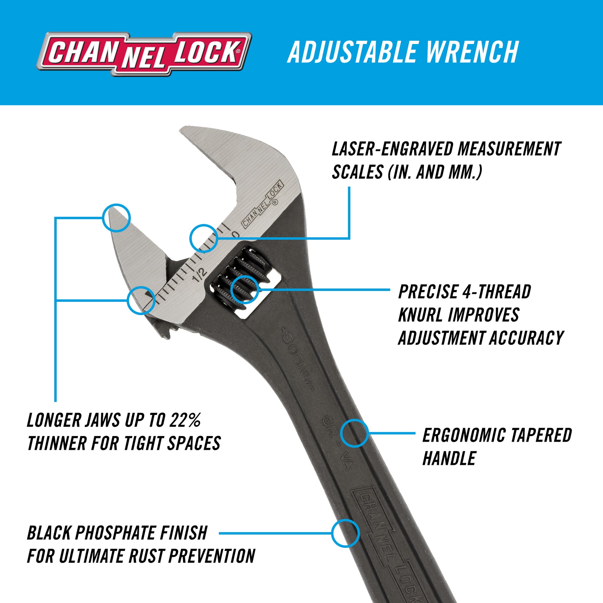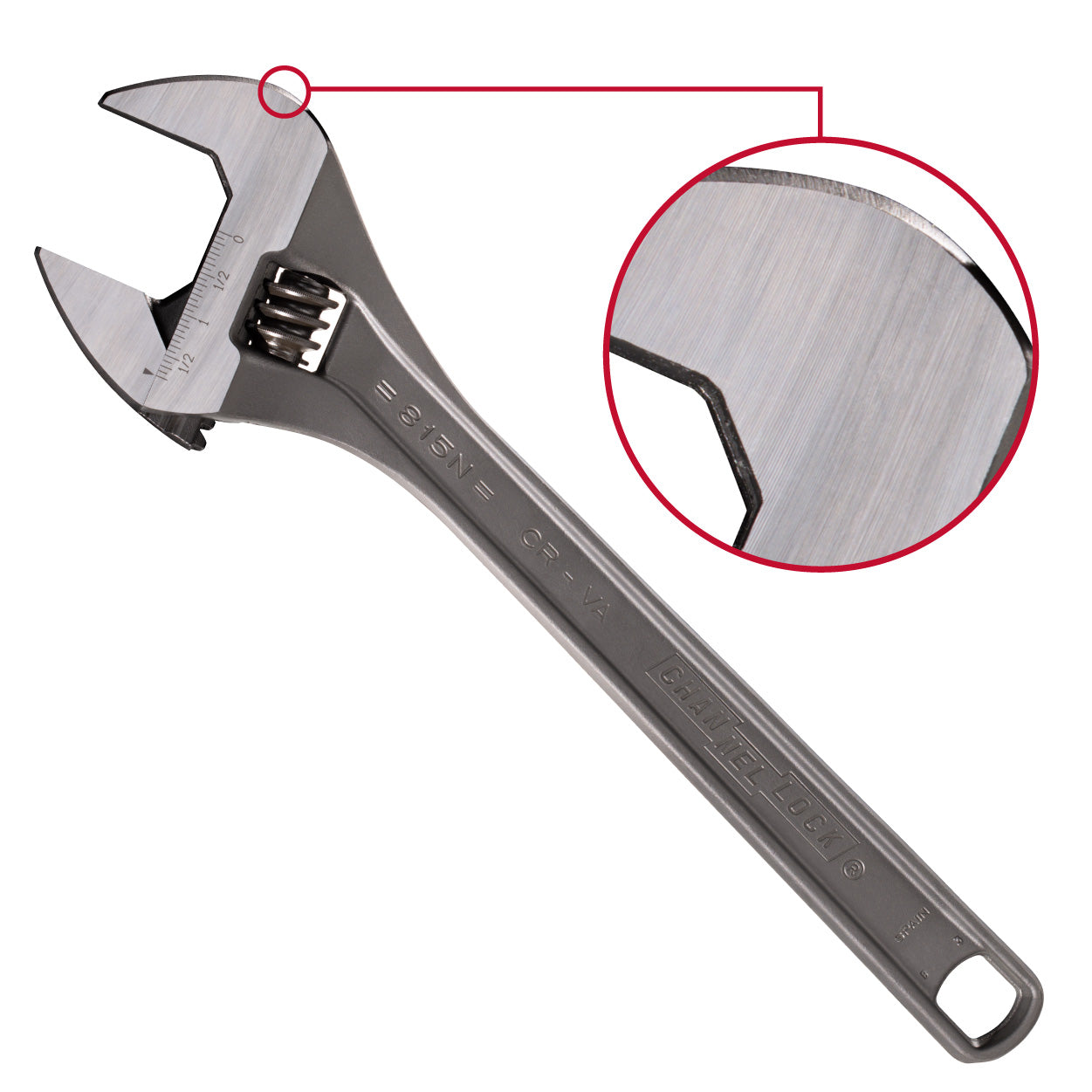 The CHANNELLOCK® 815N 15" Adjustable Wrench features non-protruding jaws for greater access in tight spaces. The combination of a smart and comfortable tapered handle design, precise 4-thread knurl and minimal head width improves performance in everyday use. CHANNELLOCK® Adjustable Wrenches are made in Spain and forged from rugged chrome vanadium steel.