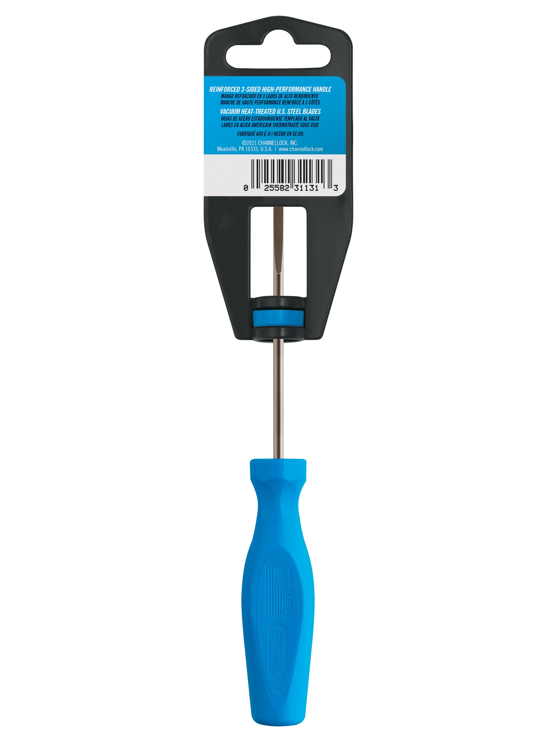 The CHANNELLOCK® Slotted 1/8 x 3-inch Professional Screwdriver offers advanced performance features to conquer the toughest jobs. Specifically designed to fit the needs of today’s trades professional, CHANNELLOCK® screwdrivers are equipped with precision-machined vacuum heat-treated tri-alloy steel blades for durability and have a non-porous, coated finish for lasting corrosion resistance. The high-torque, reinforced handles include a part indicator for easy identification, and tips are precision-machined for a proper fit on fasteners with superior control.  Exceed the expectation with CHANNELLOCK® Professional Drivers made in the USA.