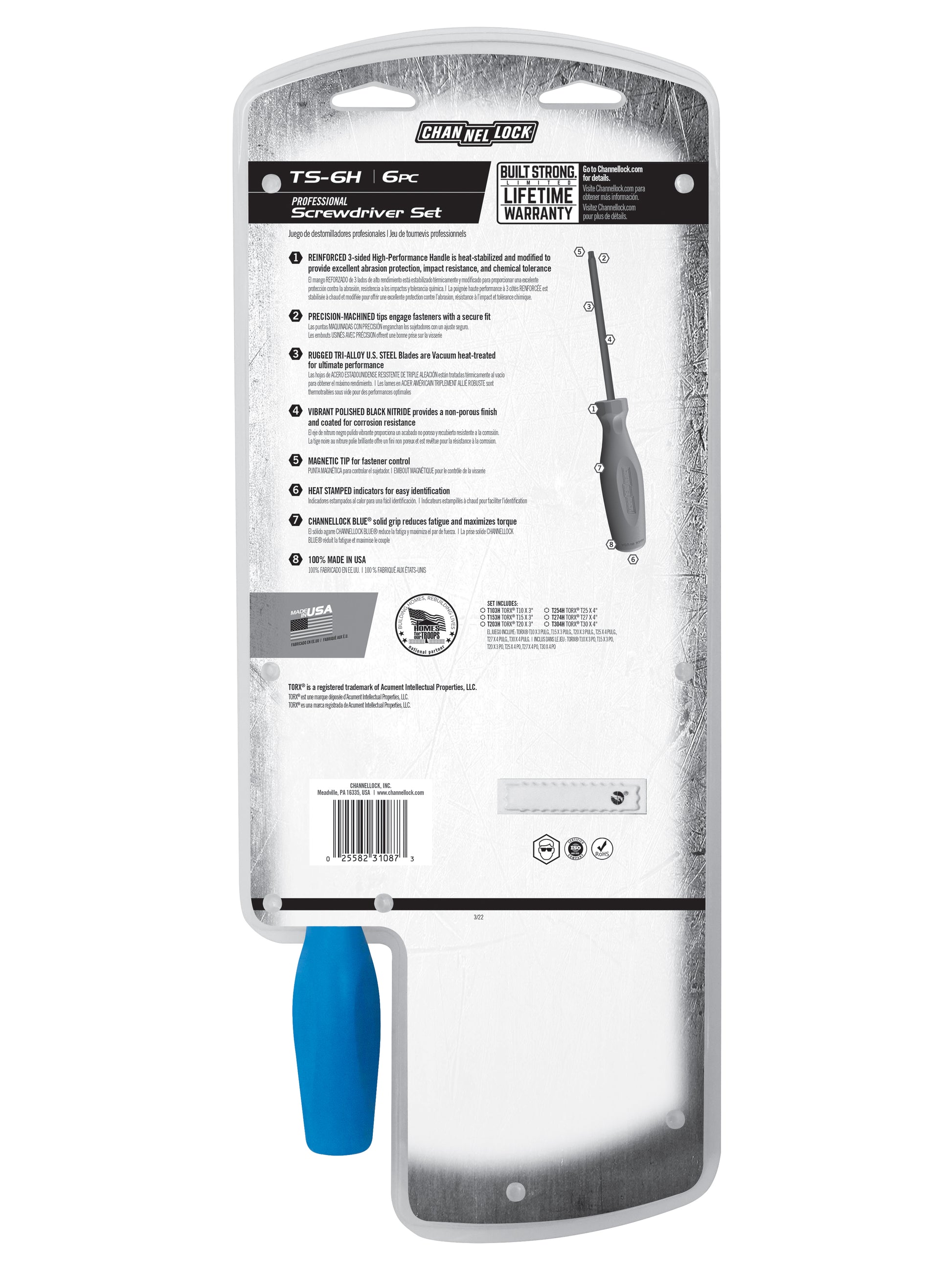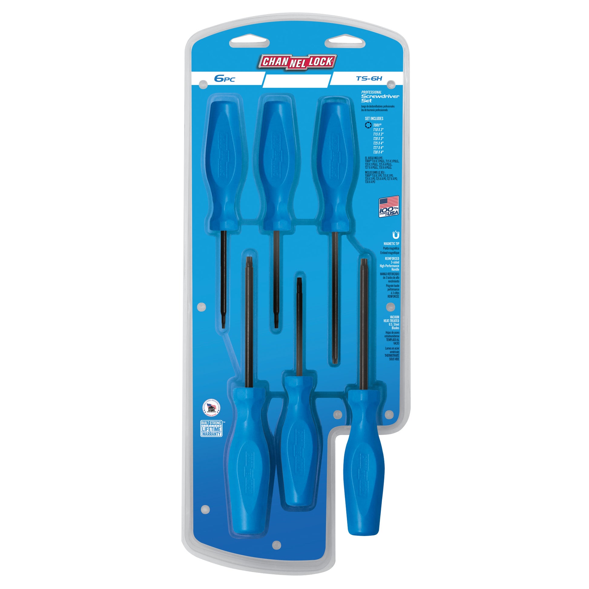 The CHANNELLOCK® 6pc Standard TORX® Screwdriver Set offers advanced performance features to conquer the toughest jobs. Specifically designed to fit the needs of today’s trades professional, CHANNELLOCK® screwdrivers are equipped with precision-machined vacuum heat-treated tri-alloy steel blades for durability and have a non-porous, coated finish for lasting corrosion resistance. The high-torque, reinforced handles include a part indicator for easy identification, and tips are precision-machined for a proper fit on fasteners with superior control. Exceed the expectation with CHANNELLOCK® Professional Drivers made in the USA.